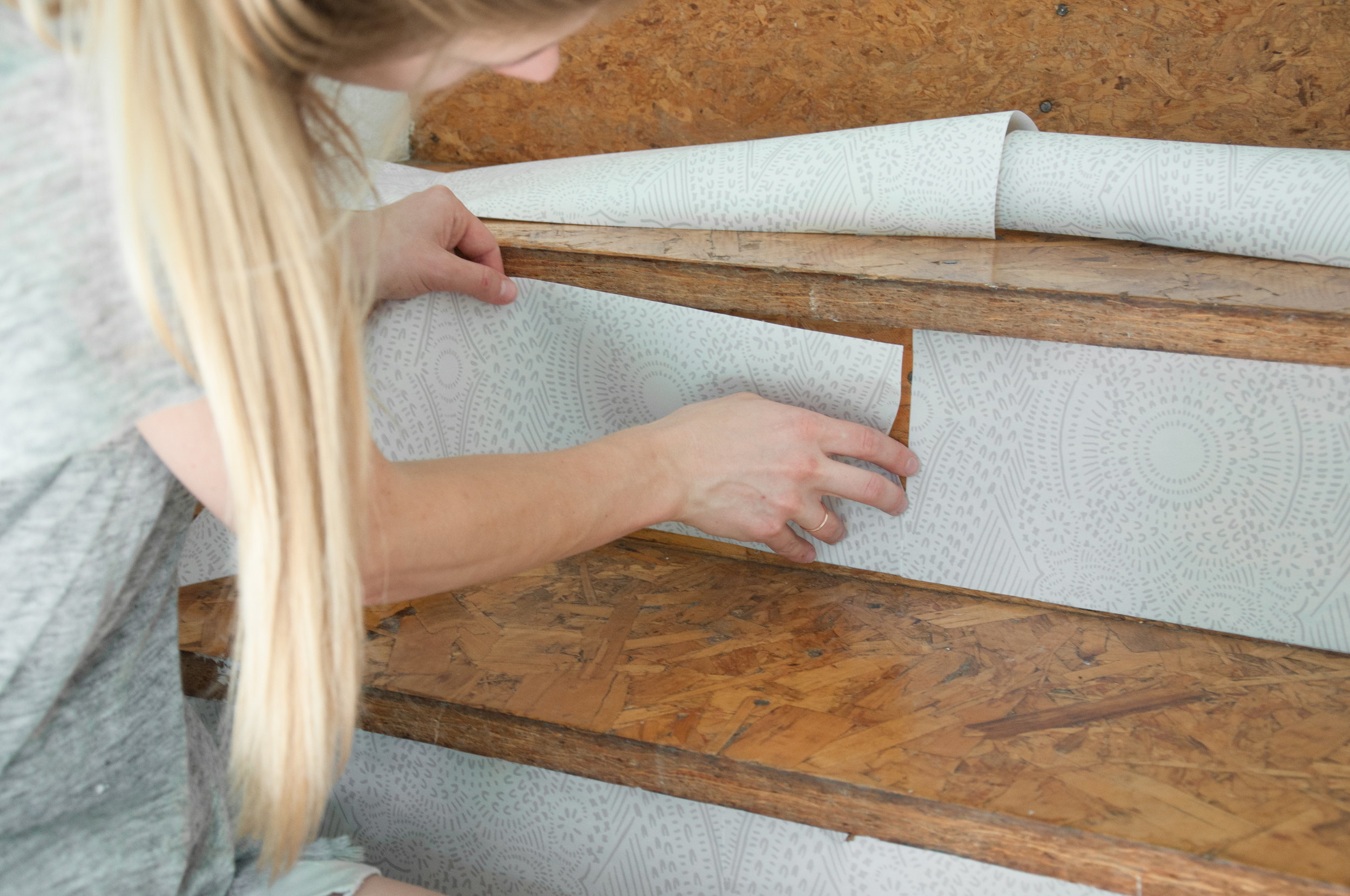 • Remember, if you're using two pieces of wallcovering per riser, I'd recommend matching the pattern in the center. It can get a little tricky when you start cutting, but just pace yourself and lay the pieces out on the floor.